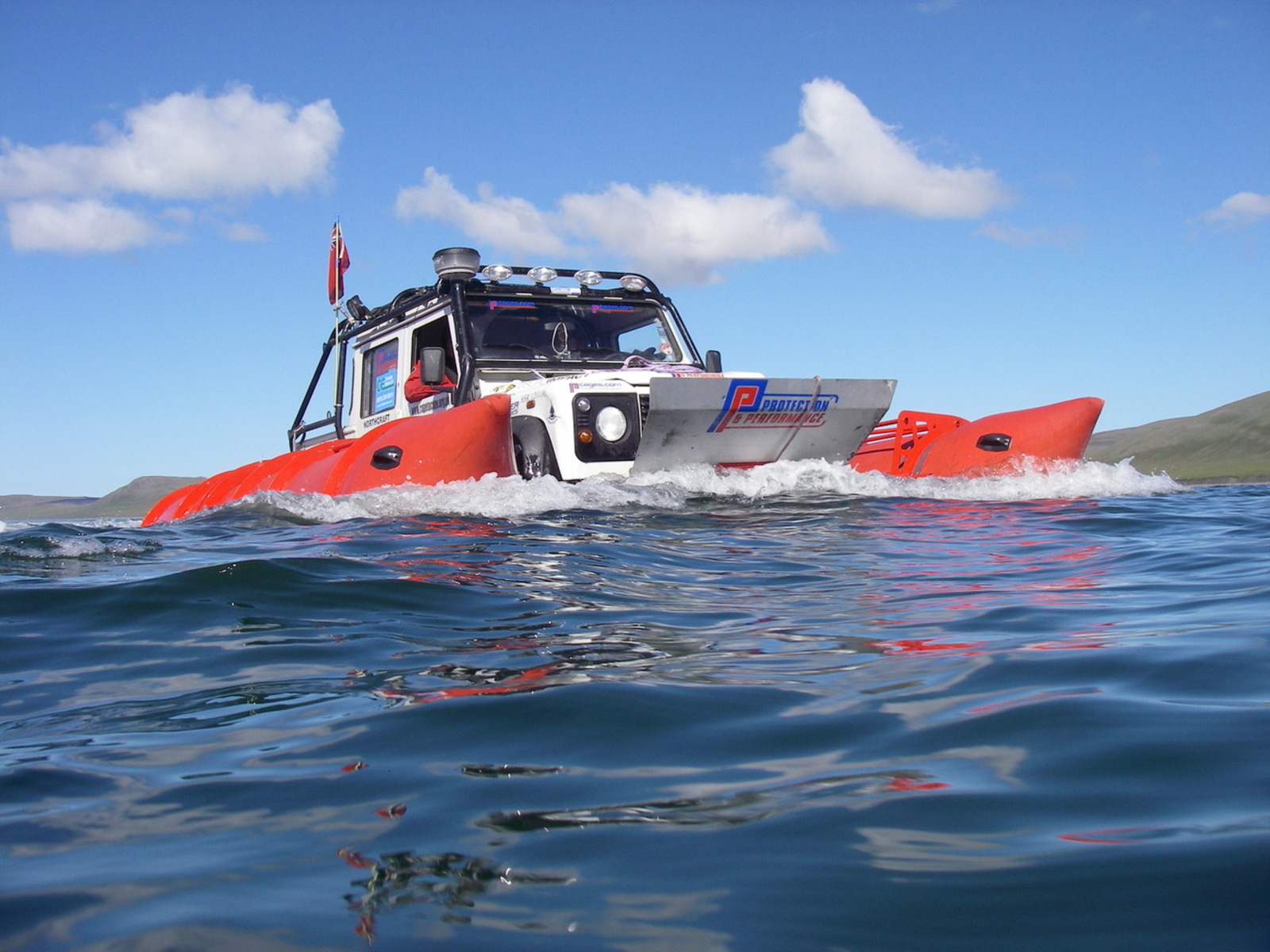 The Defender, which left the factory as a LHD to Rest of World spec with a factory-fit 300Tdi engine, was rebuilt from new with a modified and galvanised chassis. It was fitted with a PTO propellor drive and hydraulic system, pump valves and tank, a sunroof escape hatch and stall warning buzzer, together with a Warn winch, external roll cage, engine heater, 140 litre fuel tank, ARB diff-locks, and a dual-charge electrical system. The full amphibious kit included outriggers, inflatable chambered pontoons, phosphor bronze propellor, bow plate, and rudder. Bogie caterpillar tracks were also used on land when driving across deep snow.