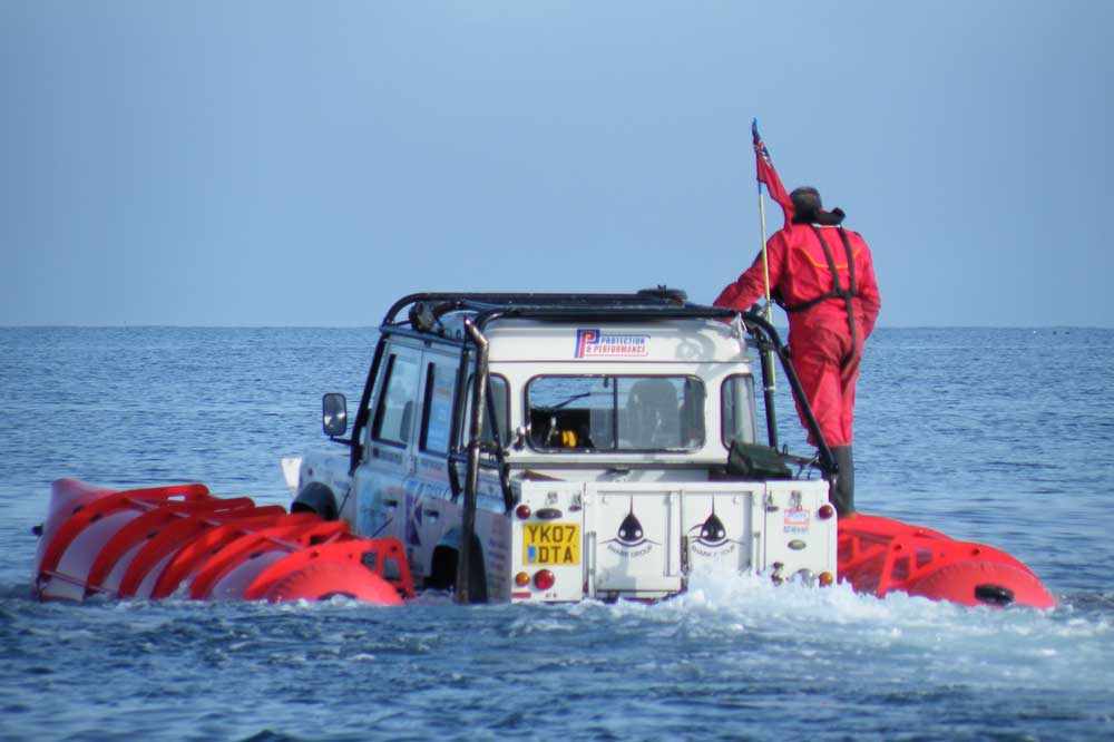The Defender, which is to LHD Rest of World spec with a factory-fit 300Tdi engine, was rebuilt from new with a modified and galvanised chassis. It was fitted with a PTO propellor drive and hydraulic system, pump valves and tank, a sunroof escape hatch and stall warning buzzer, together with a Warn winch, external roll cage, engine heater, 140 litre fuel tank, ARB diff-locks, and a dual-charge electrical system. The full amphibious kit included outriggers, inflatable chambered pontoons, phosphor bronze propellor, bow plate, and rudder. Bogie caterpillar tracks were also used on land when driving across deep snow.